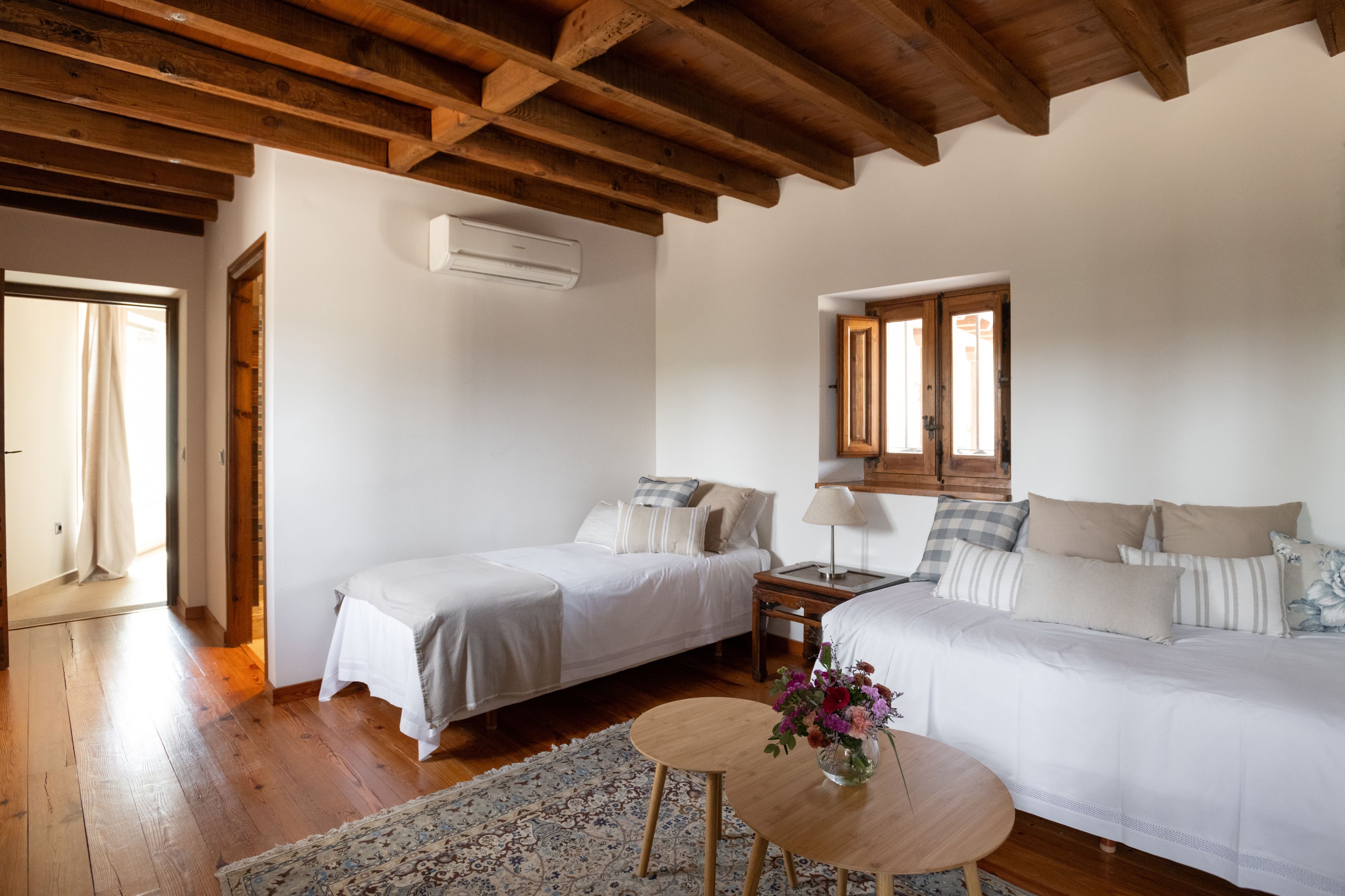 Its courtyard entrance leads into a spacious apartment on two floors, with two bedrooms and a full bath, and a terrace with outdoor seating overlooking a garden with views of the verdant hills surrounding Toledo.